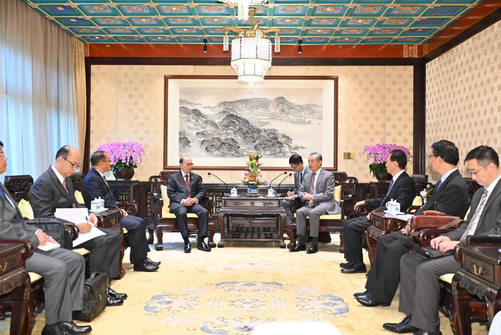Chinese Foreign Minister Wang Yi, also a member of the Political Bureau of the Communist Party of China Central Committee, meets with former Myanmar President U Thein Sein, who is in China for the Conference Marking the 70th Anniversary of the Five Principles of Peaceful Coexistence, in Beijing, capital of China, June 29, 2024. (Xinhua/Li Xiang)