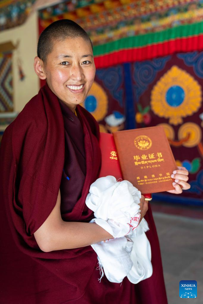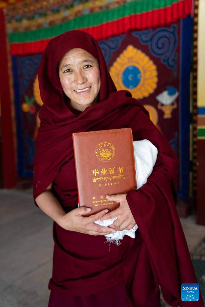 A Buddhist nun shows her diploma at the graduation ceremony at Tibet Buddhism University in Lhasa, southwest China's Xizang Autonomous Region, June 30, 2024. A graduation ceremony was organized by the Tibet Buddhism University here on Sunday, awarding the "Chi Ram Pa" diploma (master's degree) to 29 Buddhist nuns. (Xinhua/Tenzing Nima Qadhup)