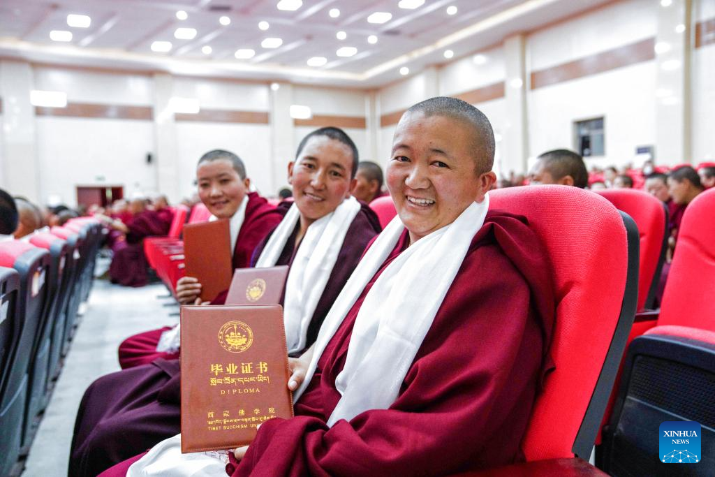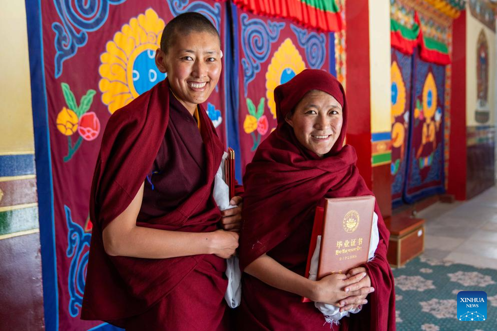 Buddhist nuns are seen at the graduation ceremony at Tibet Buddhism University in Lhasa, southwest China's Xizang Autonomous Region, June 30, 2024. A graduation ceremony was organized by the Tibet Buddhism University here on Sunday, awarding the "Chi Ram Pa" diploma (master's degree) to 29 Buddhist nuns. (Xinhua/Tenzing Nima Qadhup)