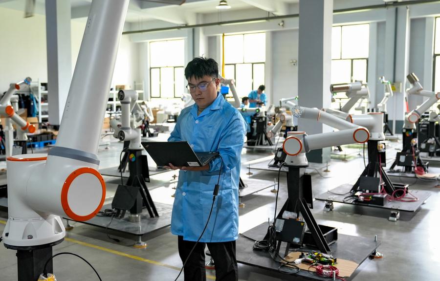 A technician adjusts robots at a workshop in Zibo City, east China's Shandong Province, May 12, 2024. (Photo by Yang Mingchao/Xinhua)