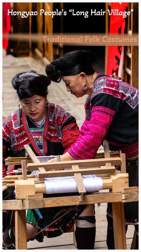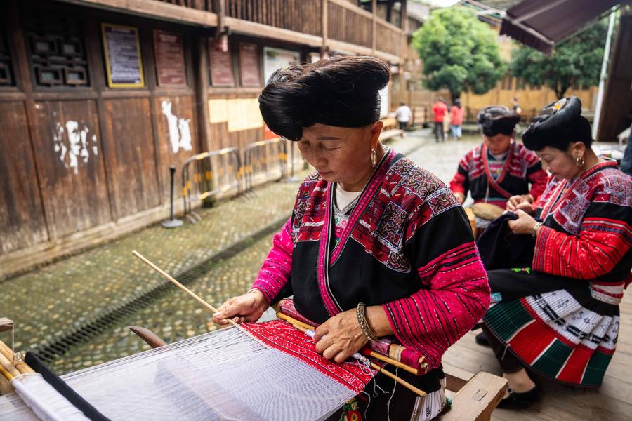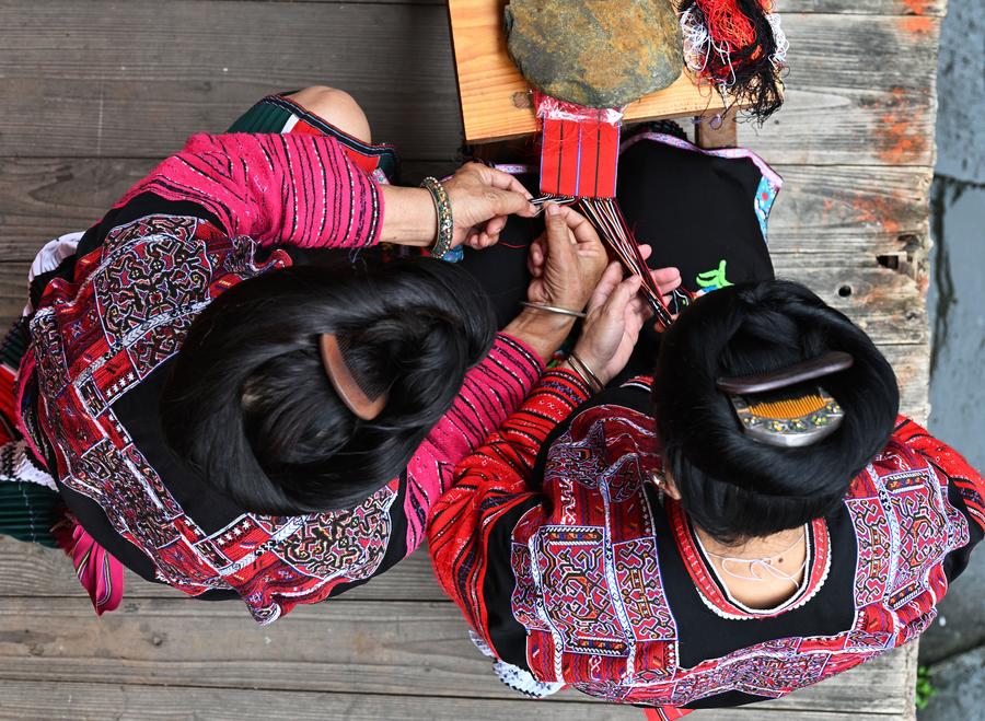 Pan Jifeng (front), an inheritor of the Yao ethnic group costume, weaves cloth in Huangluo Village of Longsheng County, south China's Guangxi Zhuang Autonomous Region, June 26, 2024. (Xinhua/Chen Sihan)