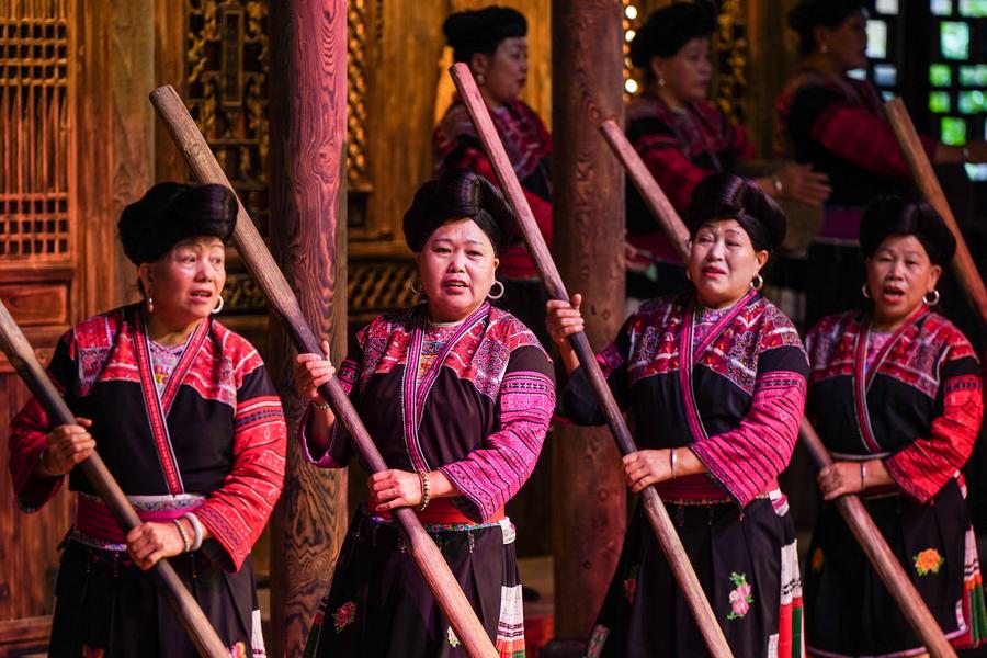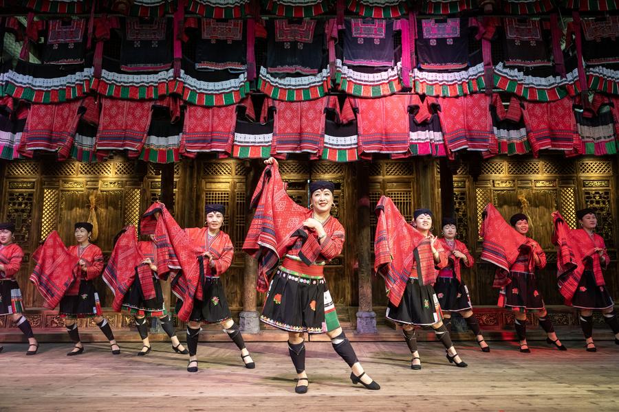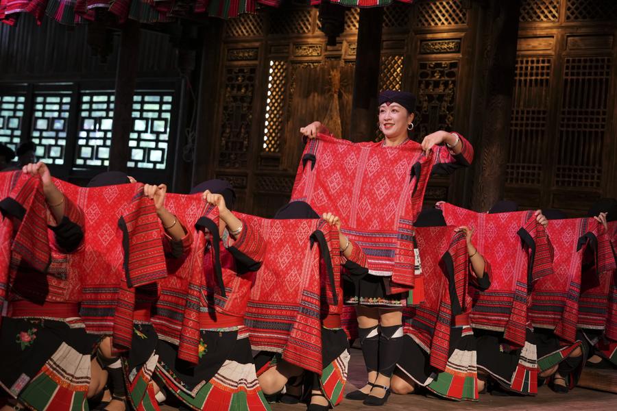 Locals stage a performance in Huangluo Village of Longsheng County, south China's Guangxi Zhuang Autonomous Region, June 26, 2024. (Xinhua/Chen Xinbo)