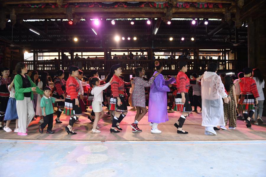 Foreign tourists interact with locals during a performance in Huangluo Village of Longsheng County, south China's Guangxi Zhuang Autonomous Region, June 27, 2024. (Xinhua/Yang Zhisen)