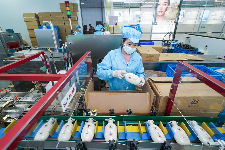 A staff member packs hair shampoos at the production line of a shampoo company in Huangluo Village of Longsheng County, south China's Guangxi Zhuang Autonomous Region, June 26, 2024. (Xinhua/Li Bo)