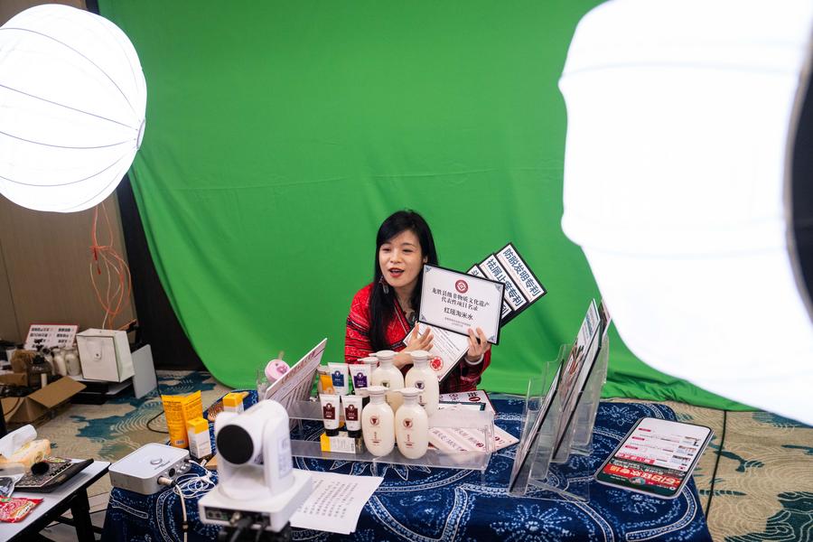 A staff member promotes products via livestreaming at a hair shampoo company in Huangluo Village of Longsheng County, south China's Guangxi Zhuang Autonomous Region, June 26, 2024.(Xinhua/Zhang Rufeng)