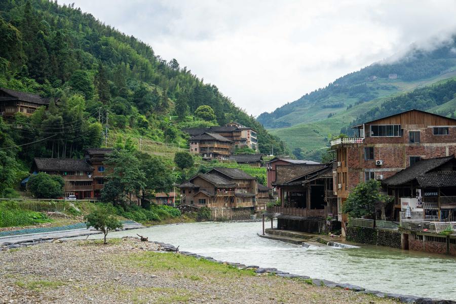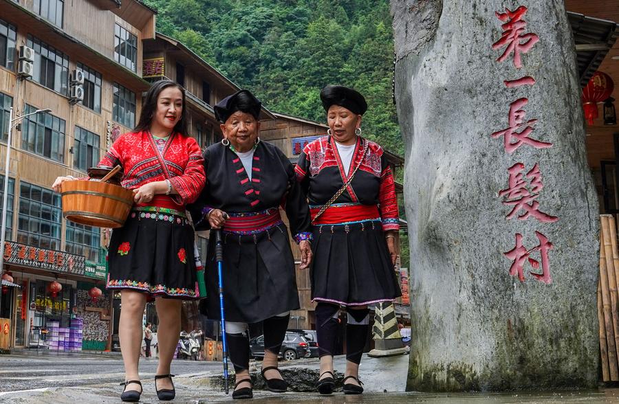 Locals walk in Huangluo Village of Longsheng County, south China's Guangxi Zhuang Autonomous Region, June 26, 2024. (Xinhua/Zhang Ailin)