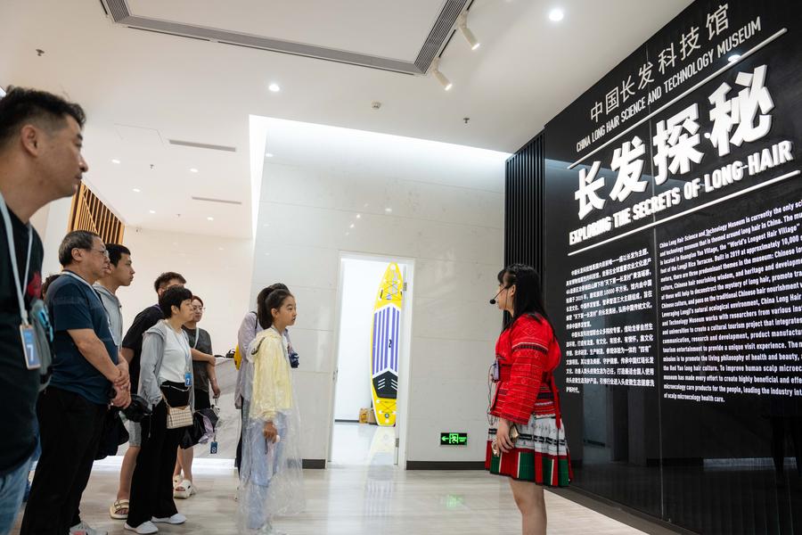 People visit the China Long Hair Science and Technology Museum in Huangluo Village of Longsheng County, south China's Guangxi Zhuang Autonomous Region, June 26, 2024. (Xinhua/Chen Sihan)