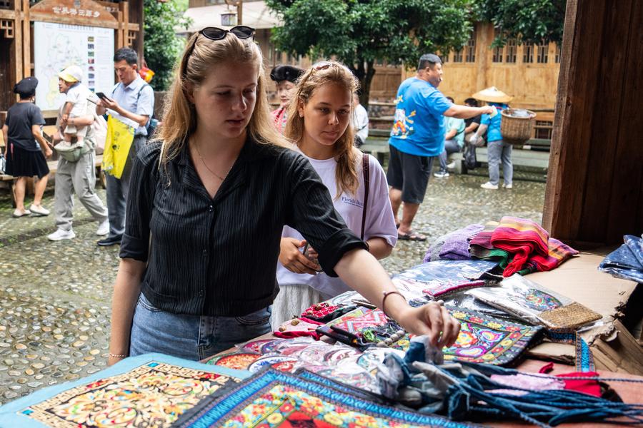Foreign tourists select local specialties in Huangluo Village of Longsheng County, south China's Guangxi Zhuang Autonomous Region, June 27, 2024. (Xinhua/Li Bo)