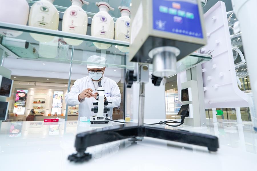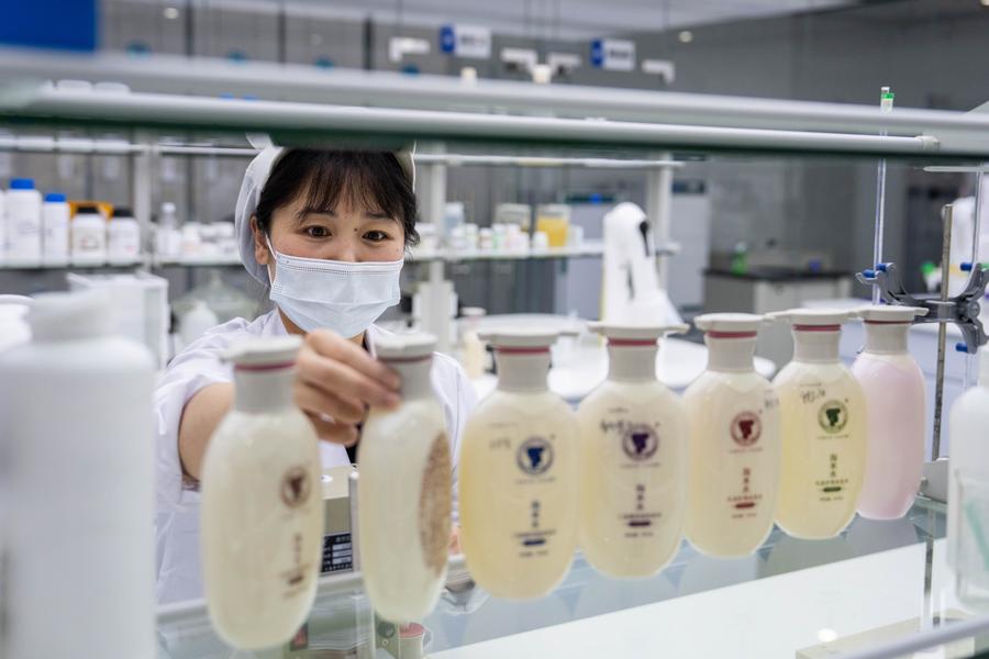A staff member develops hair shampoo varieties at a shampoo company's lab in Huangluo Village of Longsheng County, south China's Guangxi Zhuang Autonomous Region, June 26, 2024. (Xinhua/Zhang Ailin)