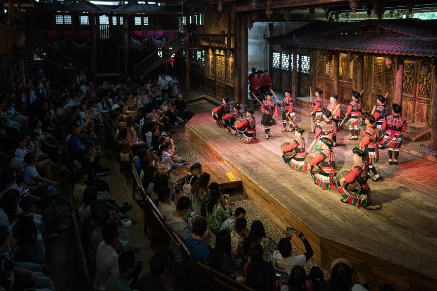 Tourists watch a performance staged by locals in Huangluo Village of Longsheng County, south China's Guangxi Zhuang Autonomous Region, June 26, 2024.(Xinhua/Zhang Rufeng)