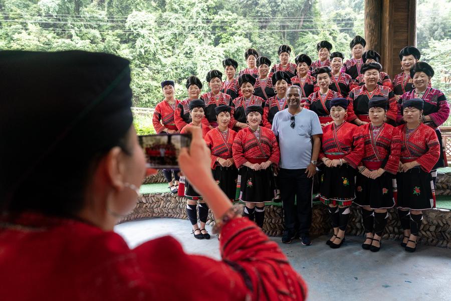An Ethiopian tourist poses for photos with locals after a performance in Huangluo Village of Longsheng County, south China's Guangxi Zhuang Autonomous Region, June 26, 2024. (Xinhua/Li Bo)