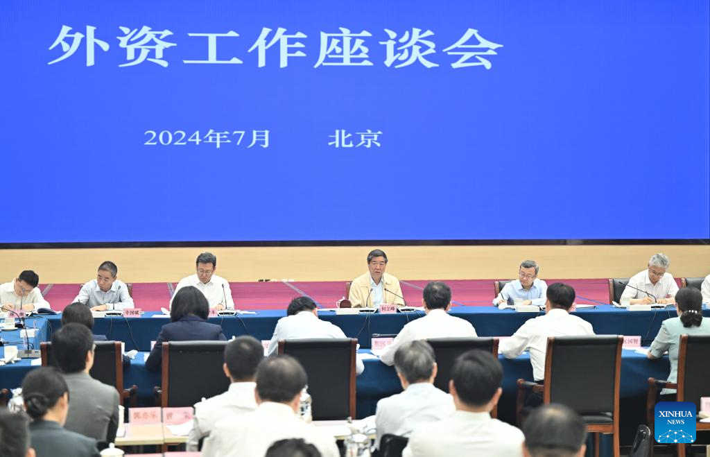 Chinese Vice Premier He Lifeng, also a member of the Political Bureau of the Communist Party of China Central Committee, chairs a symposium on foreign investment work in Beijing, capital of China, July 1, 2024. (Xinhua/Li Xiang)