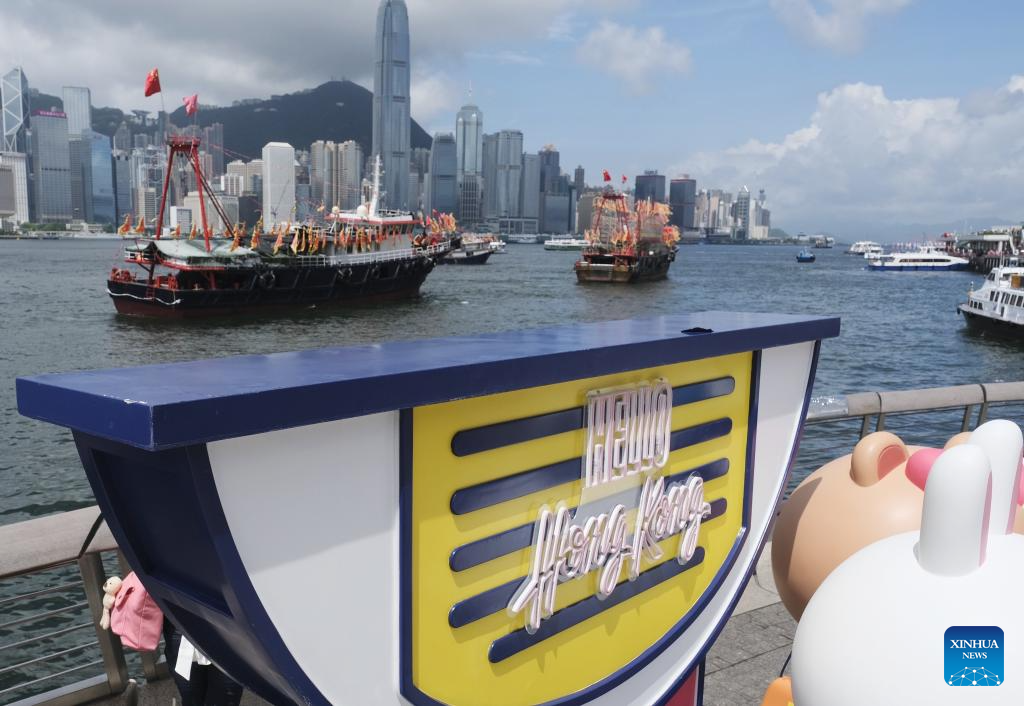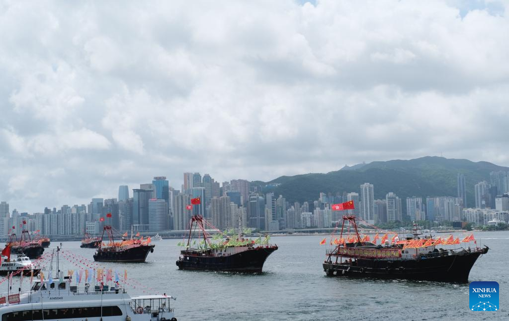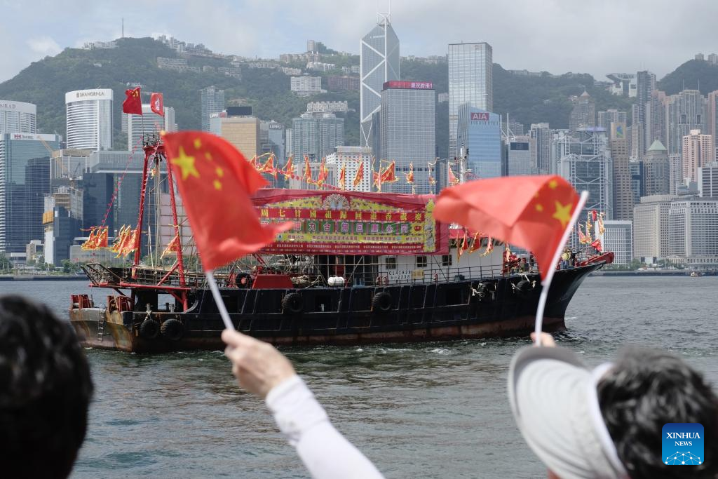 Fishing vessels take part in a cruise held by the Hong Kong Fishermen Consortium to celebrate the 27th anniversary of Hong Kong's return to the motherland at Victoria Harbour in Hong Kong, south China, July 1, 2024. (Xinhua/Wang Shen)