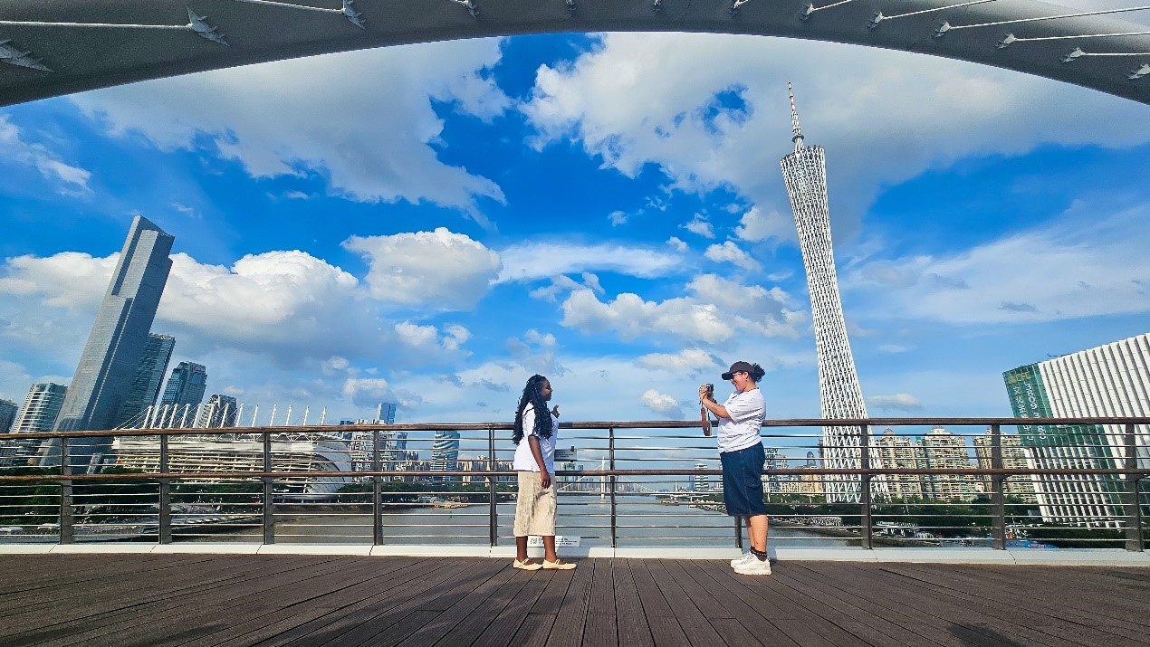 Two British students, Roberta Rennie (left) and Amelia Sleight, take photos at Haixin Bridge, a landmark in Guangzhou, south China's Guangdong Province, July 1, 2024. (Photo provided to People's Daily Online)