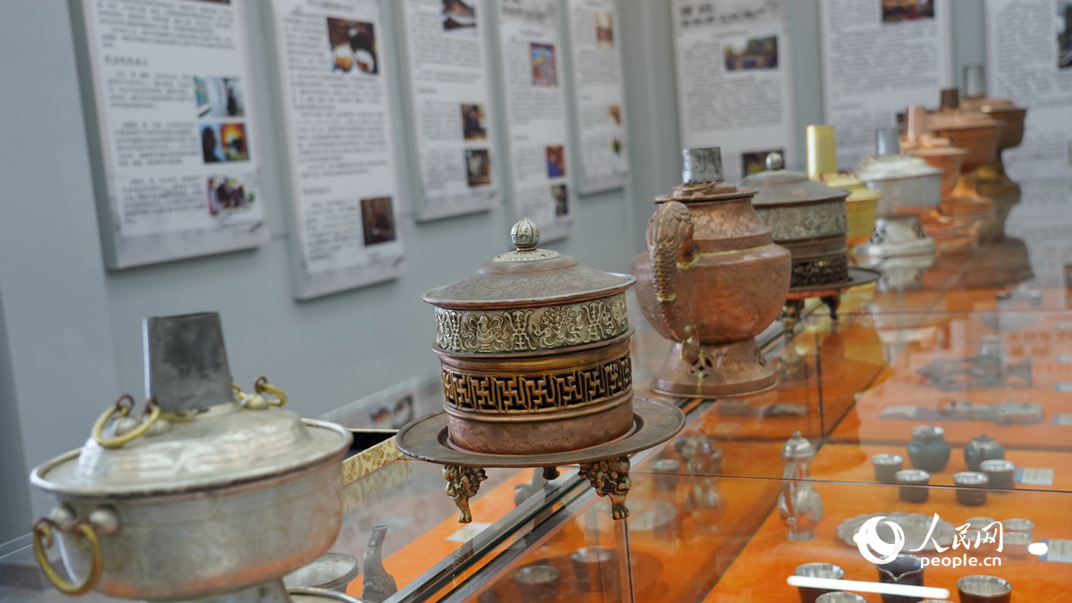 Silver and copper crafts, a national intangible cultural heritage item, are displayed at an intangible cultural heritage exhibition hall in Huangzhong district of Xining, the capital city of northwest China's Qinghai Province. (People's Daily Online/Yang Qihong)