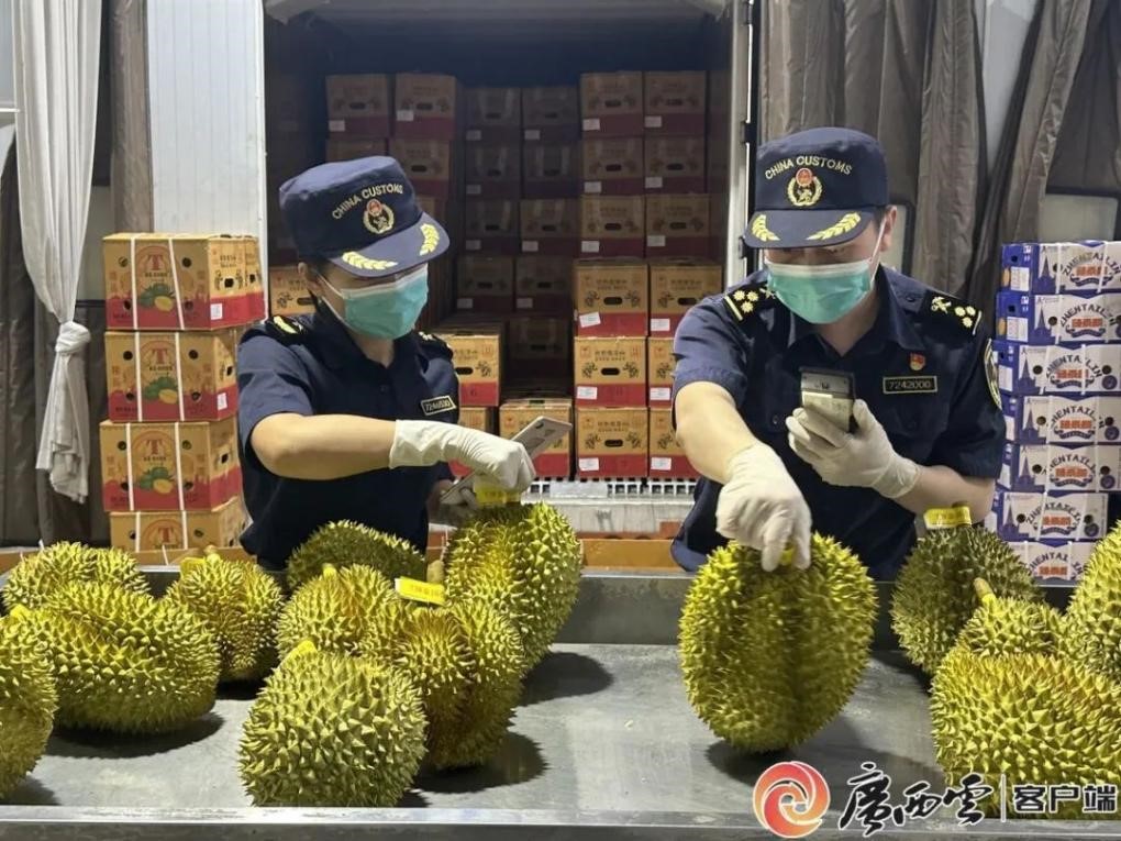 Customs officers inspect imported durians in south China's Guangxi Zhuang autonomous region. (Photo/Huang Lina)