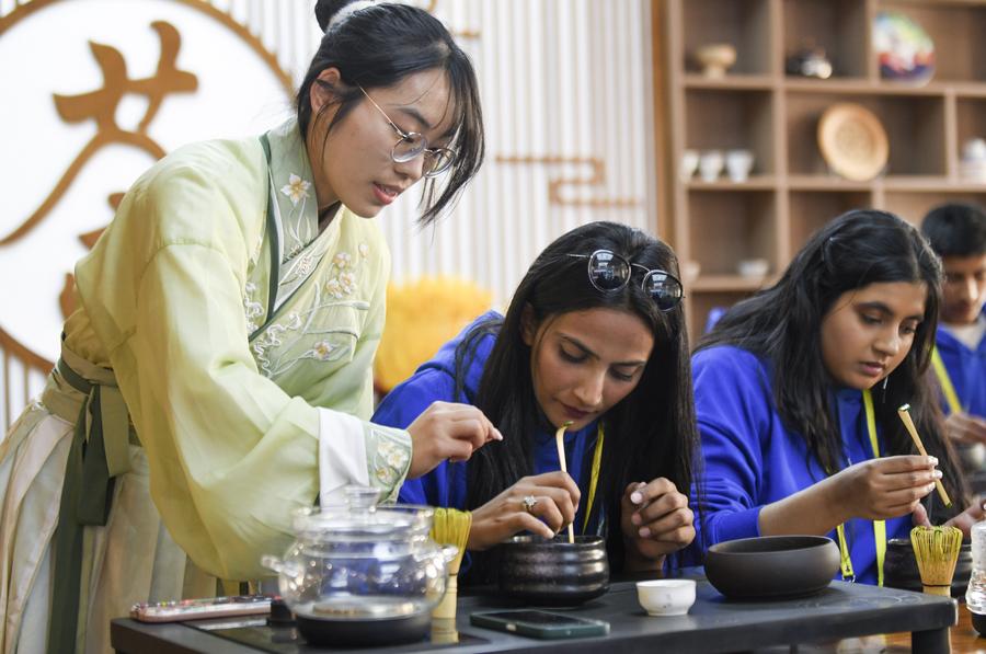Students learn tea art under the instruction of a student (L) from Xinjiang Normal University during the 2024 "Chinese Bridge" Spring Camp for students from SCO countries, in northwest China's Xinjiang Uygur Autonomous Region, April 15, 2024. (Xinhua/Wang Fei)