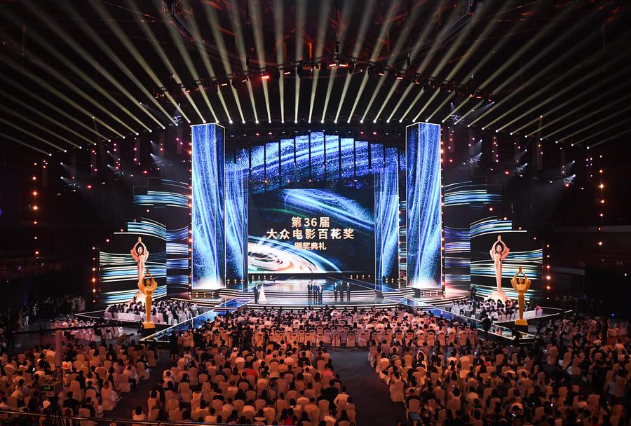 This photo shows the awarding ceremony of the 36th Hundred Flowers Awards, which was held in Wuhan, central China's Hubei Province, July 30, 2022. (Photo by Cheng Min/Xinhua)