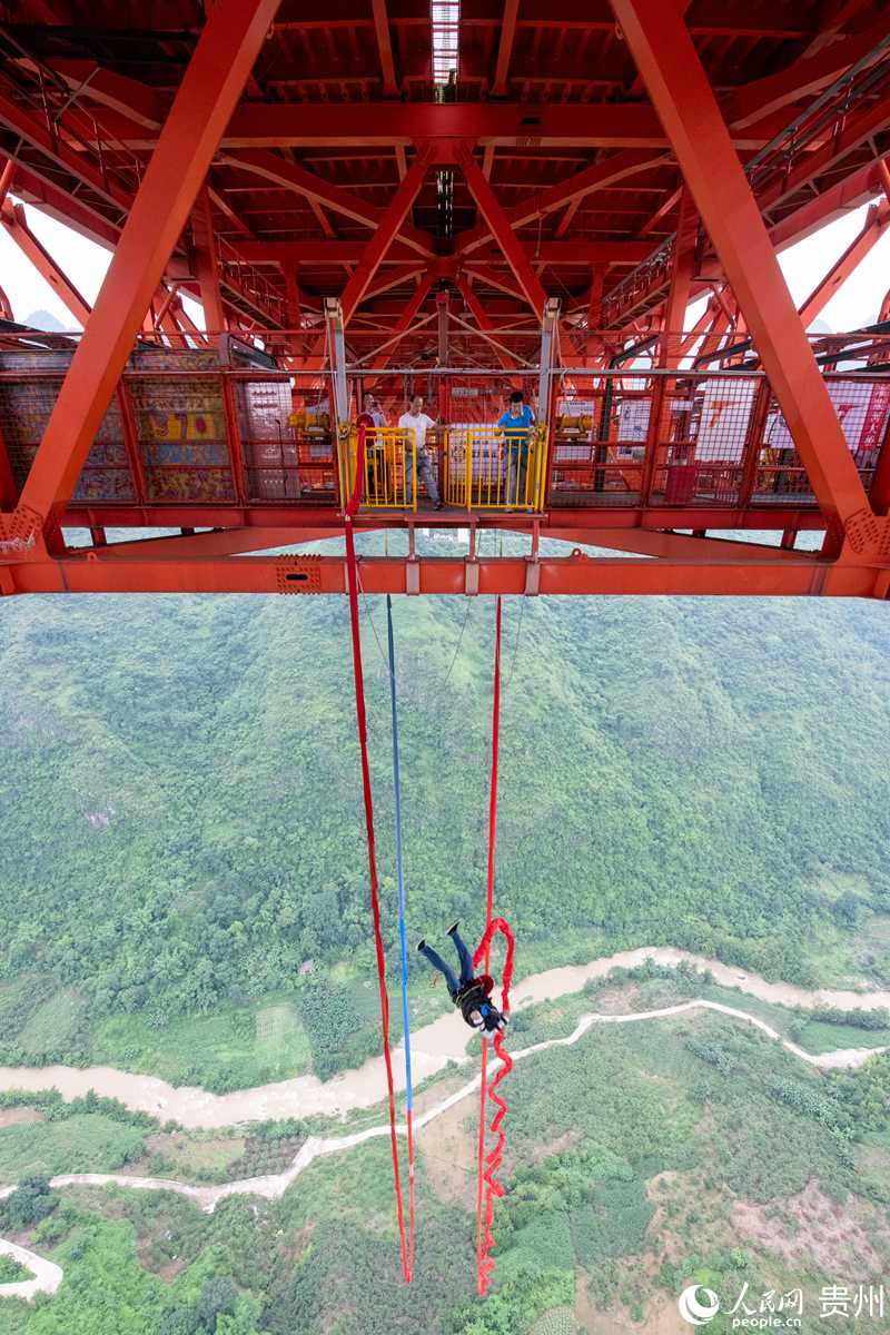 A man goes bungee jumping from a platform on the Baling River Bridge in southwest China's Guizhou Province. (People's Daily Online/Weng Qiyu)