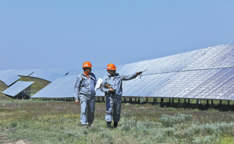 Workers monitor solar panels at a solar power plant jointly built by China and Kazakhstan in the town of Kapchagay, in southeastern Kazakhstan's Almaty Region. XINHUA