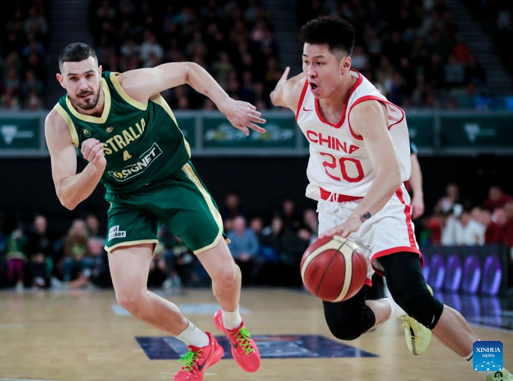 Liao Sanning (R) of China vies with Dyson Daniels of Australia during the men's basketball match of the Ford Ballin'24 between China and Australia in Melbourne, Australia, July 2, 2024. (Xinhua/Ma Ping)