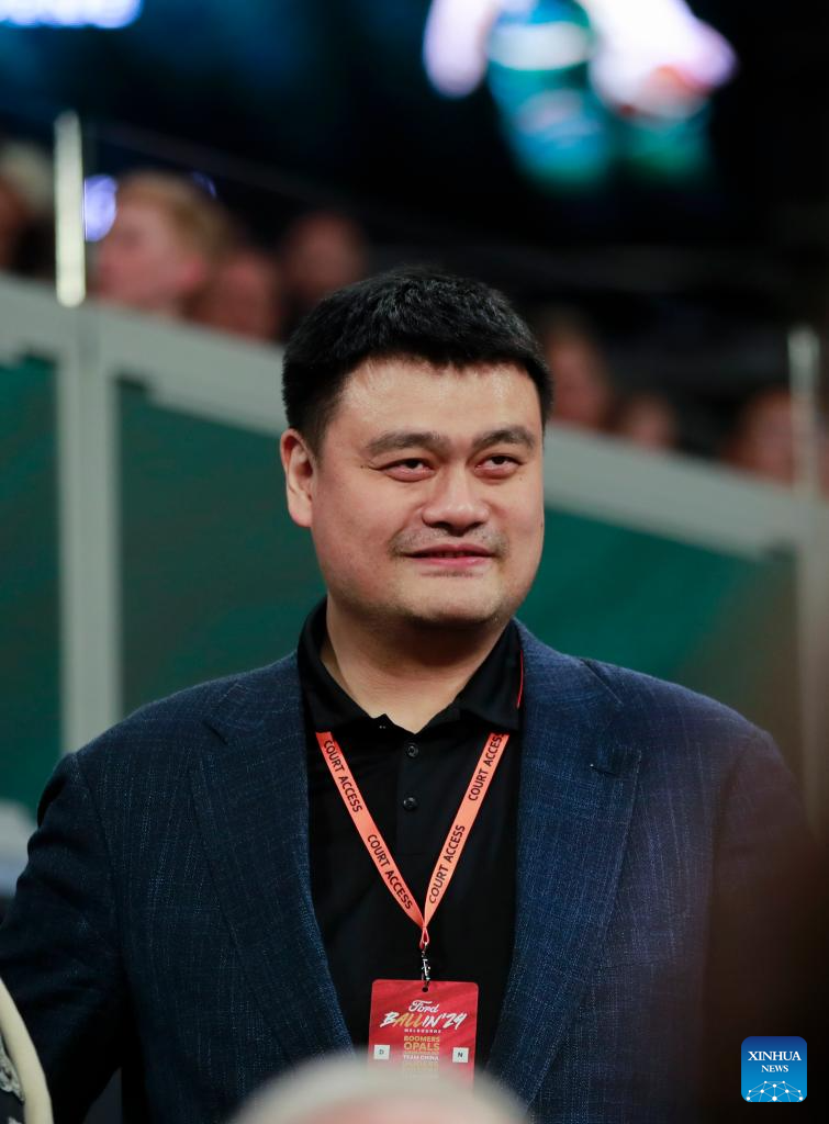 Chinese Basketball Association president Yao Ming reacts before the men's basketball match of the Ford Ballin'24 between China and Australia in Melbourne, Australia, July 2, 2024. (Xinhua/Ma Ping)