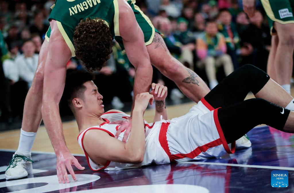 Cui Xiaolong (bottom) of China falls during the men's basketball match of the Ford Ballin'24 between China and Australia in Melbourne, Australia, July 2, 2024. (Xinhua/Ma Ping)