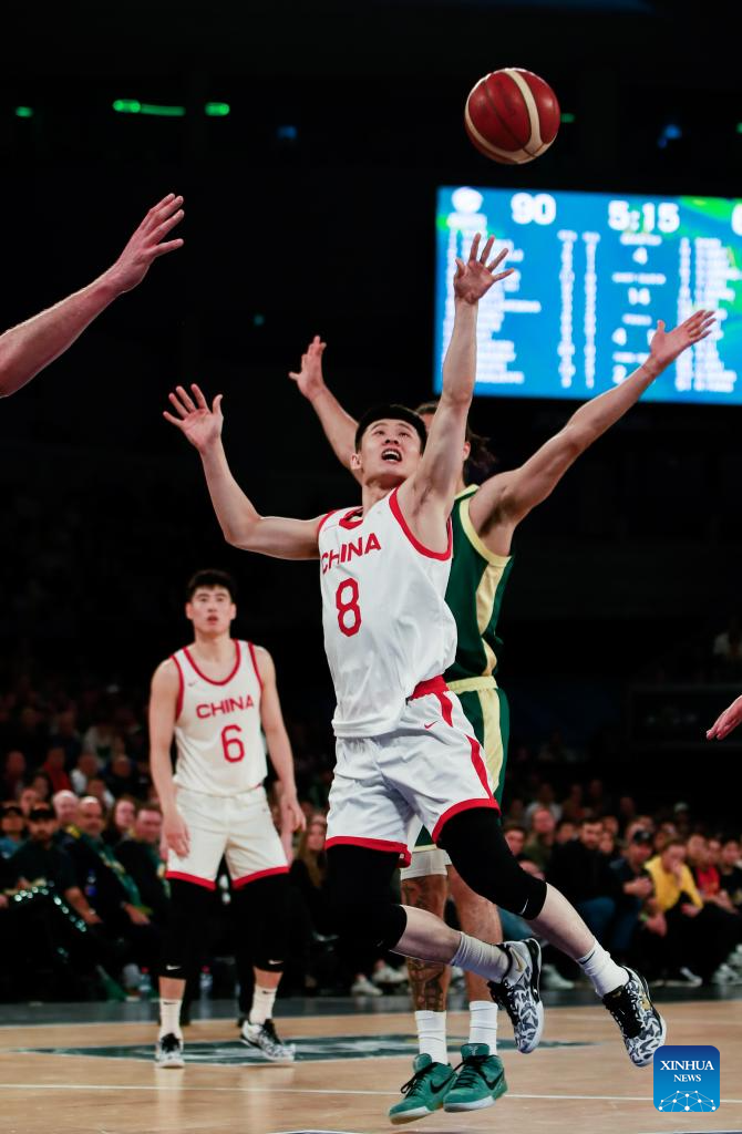 Wang Lanqin (front) of China competes during the men's basketball match of the Ford Ballin'24 between China and Australia in Melbourne, Australia, July 2, 2024. (Xinhua/Ma Ping)
