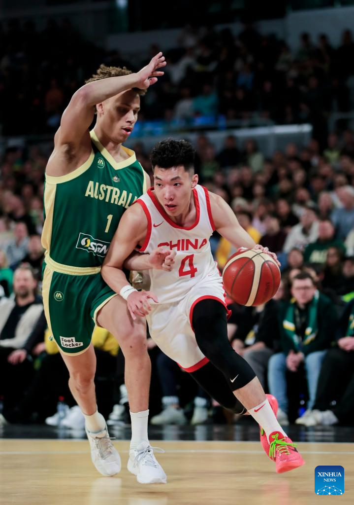 Cui Xiaolong (R) of China vies with Chris Goulding of Australia during the men's basketball match of the Ford Ballin'24 between China and Australia in Melbourne, Australia, July 2, 2024. (Xinhua/Ma Ping)