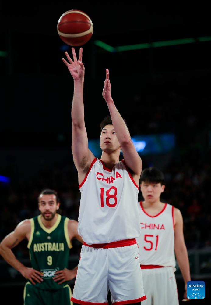 Du Runwang (front) of China takes a penalty shot during the men's basketball match of the Ford Ballin'24 between China and Australia in Melbourne, Australia, July 2, 2024. (Xinhua/Ma Ping)