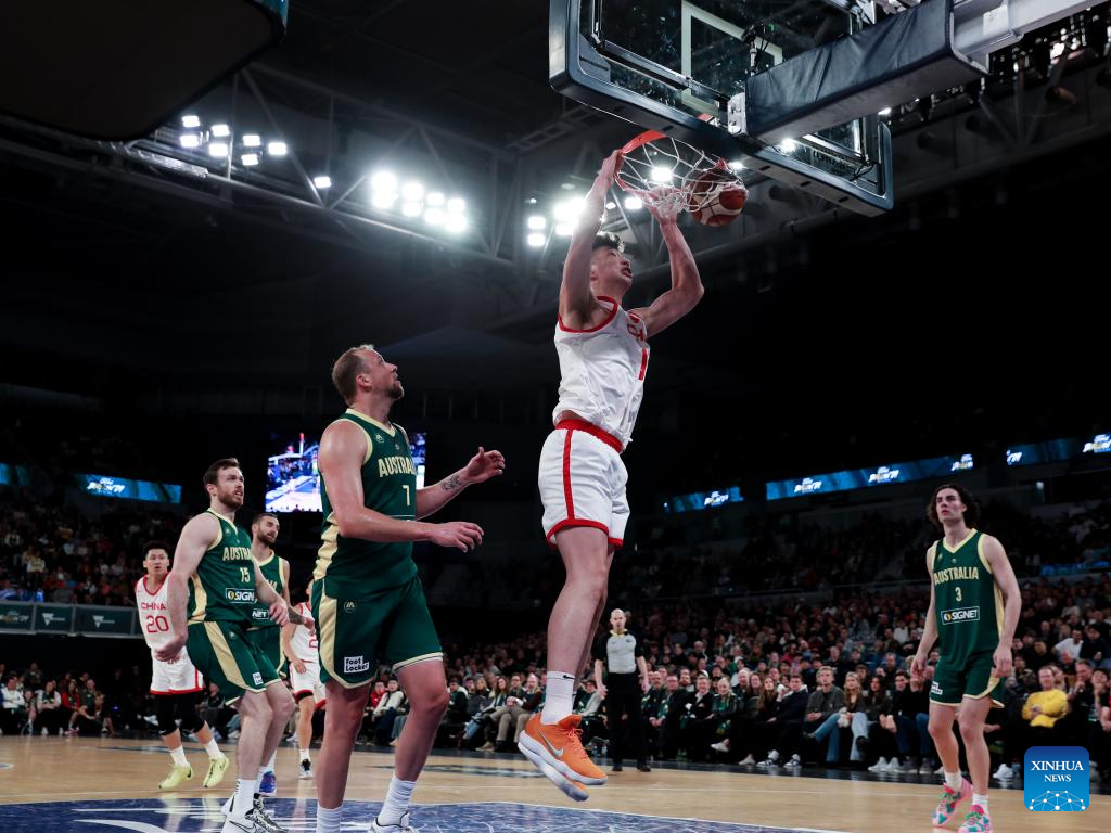 Yu Jiahao (top) of China dunks during the men's basketball match of the Ford Ballin'24 between China and Australia in Melbourne, Australia, July 2, 2024. (Xinhua/Ma Ping)