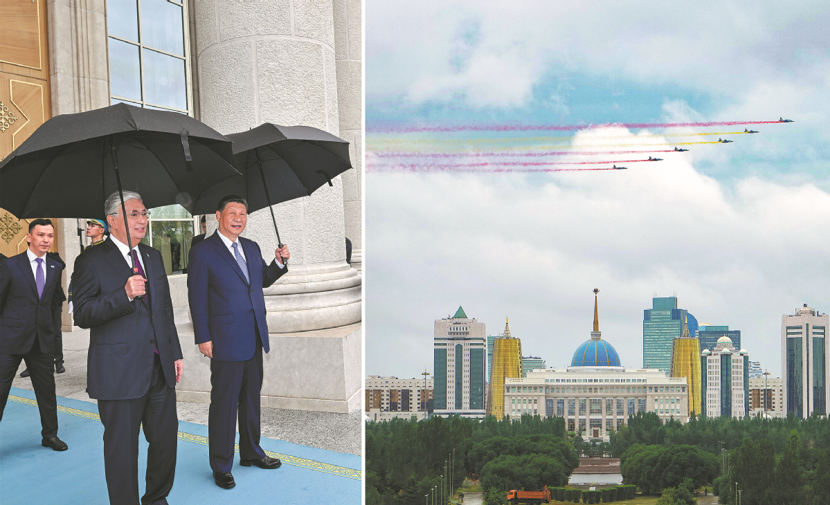 President Xi Jinping and Kazakh President Kassym-Jomart Tokayev watch as six Kazakh Air Force fighter jets fly overhead, trailing red and yellow smoke to symbolize the Chinese flag, during a welcoming ceremony on Wednesday in Astana, the capital of Kazakhstan. (WANG JIANHUA/YIN BOGU/XINHUA)