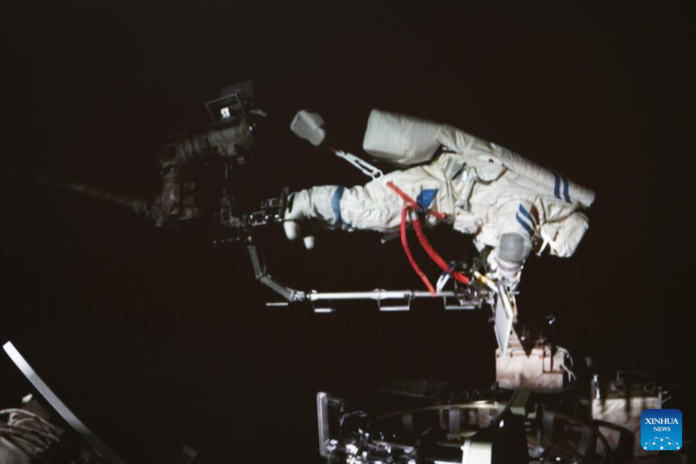 This screen image captured at Beijing Aerospace Control Center on July 3, 2024 shows Shenzhou-18 astronaut Ye Guangfu performing extravehicular activities. The Shenzhou-18 taikonauts on board China's orbiting space station completed their second spacewalk at 10:51 p.m. (Beijing Time) on Wednesday, according to the China Manned Space Agency. (Xinhua/Guo Zhongzheng)