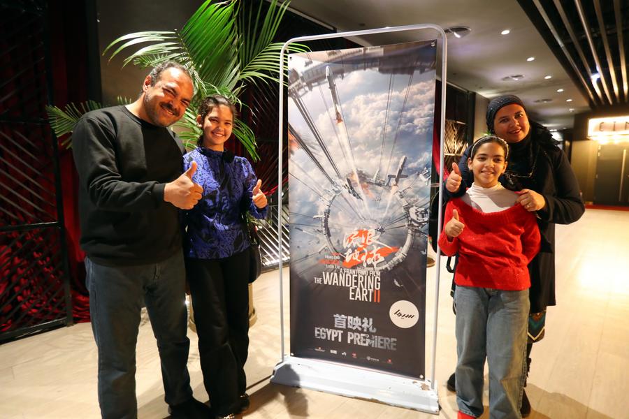 People pose for a photo with a poster of the movie "The Wandering Earth II" at a theater in Giza, Egypt, March 11, 2023. (Xinhua/Sui Xiankai)
