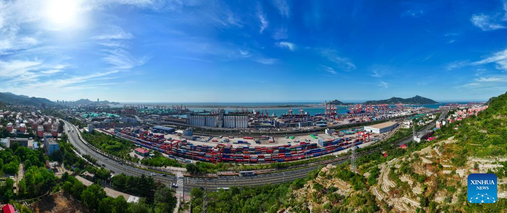 An aerial drone photo taken on June 26, 2024 shows freight ships docked at the container terminal of Lianyungang Port, east China's Jiangsu Province. (Xinhua/Ji Chunpeng)