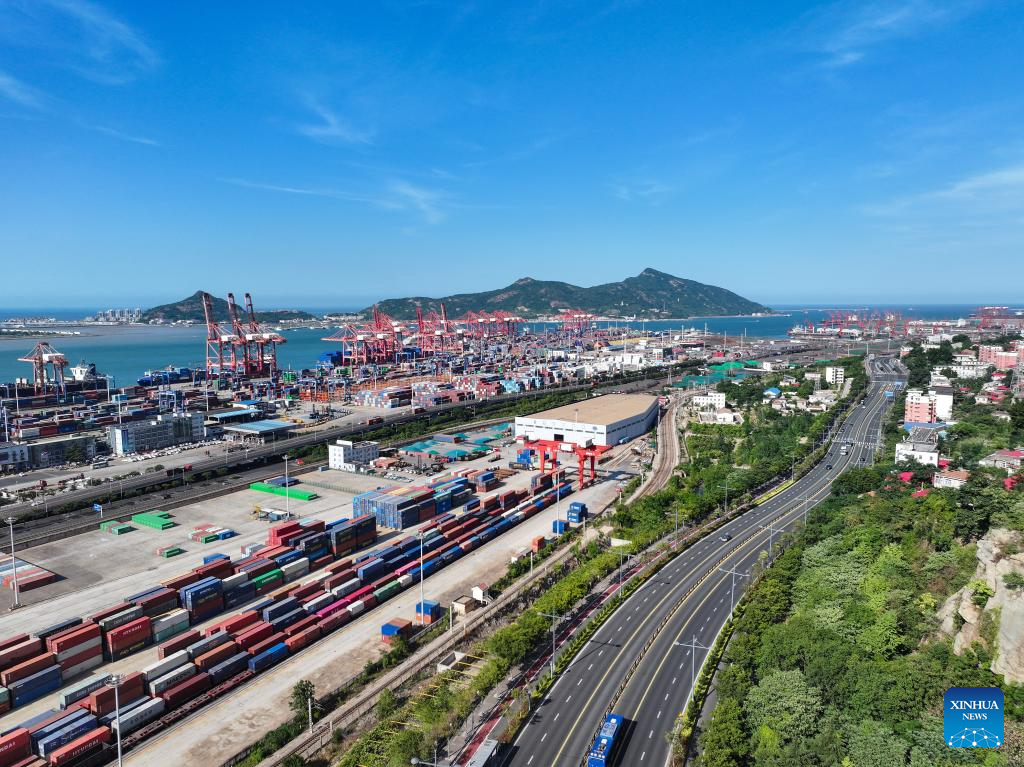 An aerial drone photo taken on June 26, 2024 shows freight ships docked at the container terminal of Lianyungang Port, east China's Jiangsu Province. (Xinhua/Ji Chunpeng)?