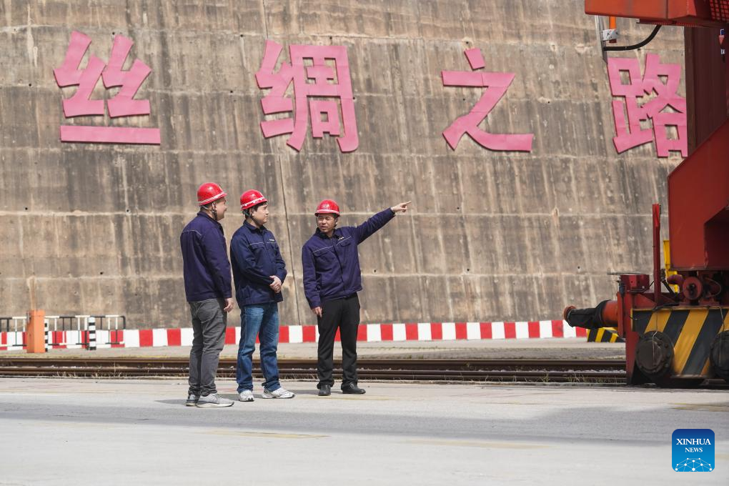 Chinese and Kazakhstan staff members communicate at the China-Kazakhstan (Lianyungang) Logistics Cooperation Base in Lianyungang, east China's Jiangsu Province, May 10, 2023. (Xinhua/Ji Chunpeng)
