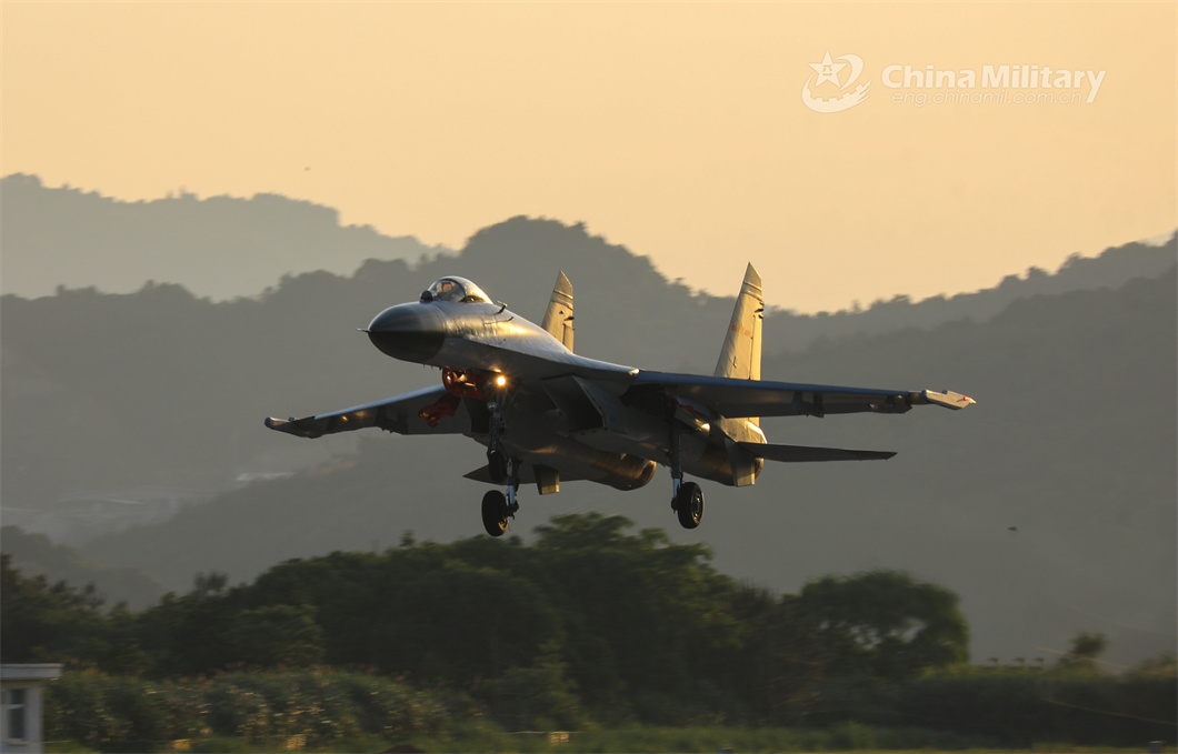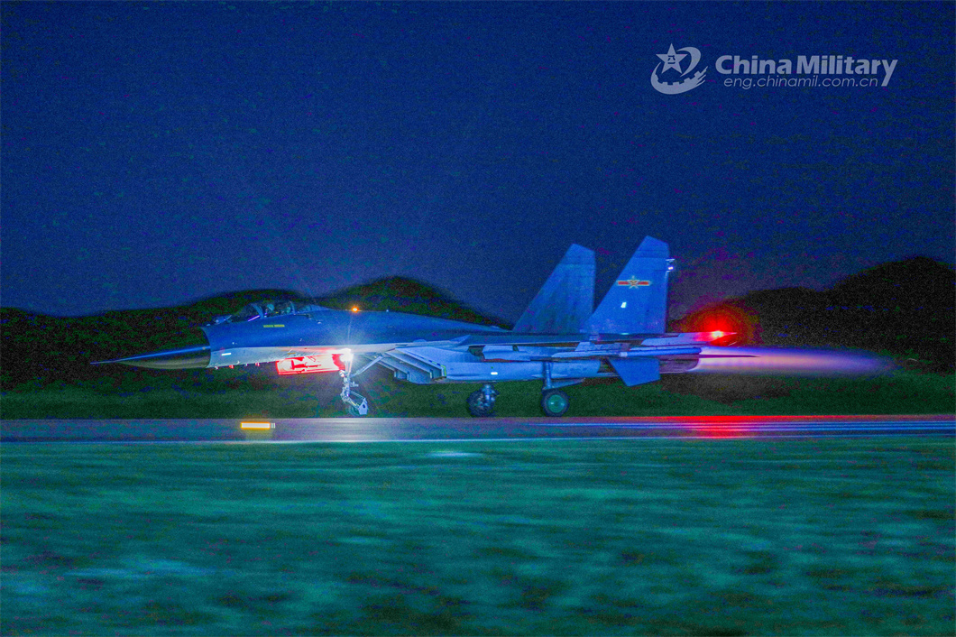 A fighter jet attached to an aviation unit with the air force under the PLA Eastern Theater Command takes off from the runway for a night flight training exercise on June 10, 2024. (eng.chinamil.com.cn/Photo by Li Kai)