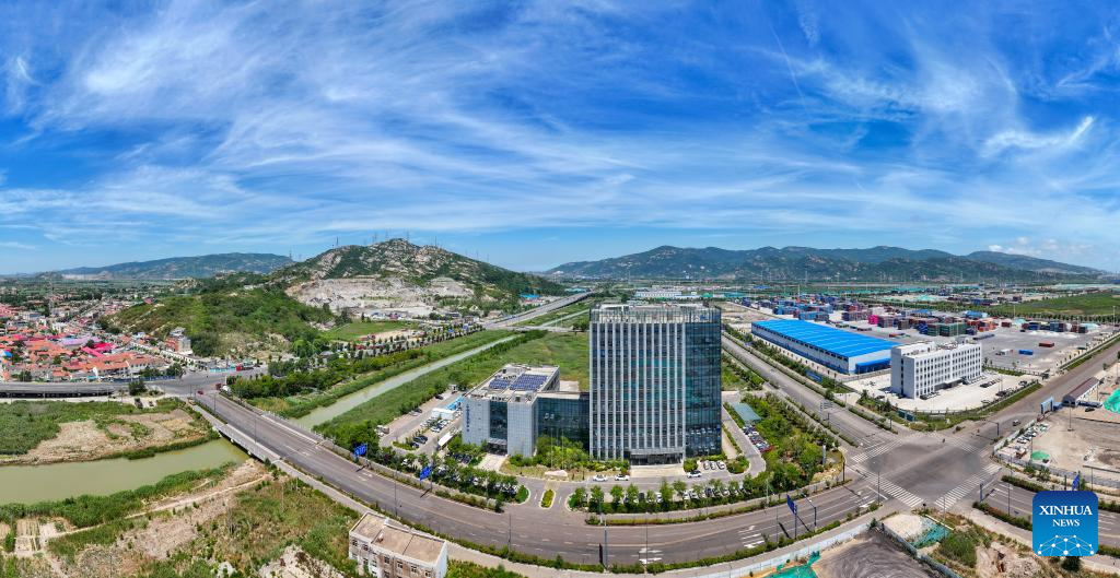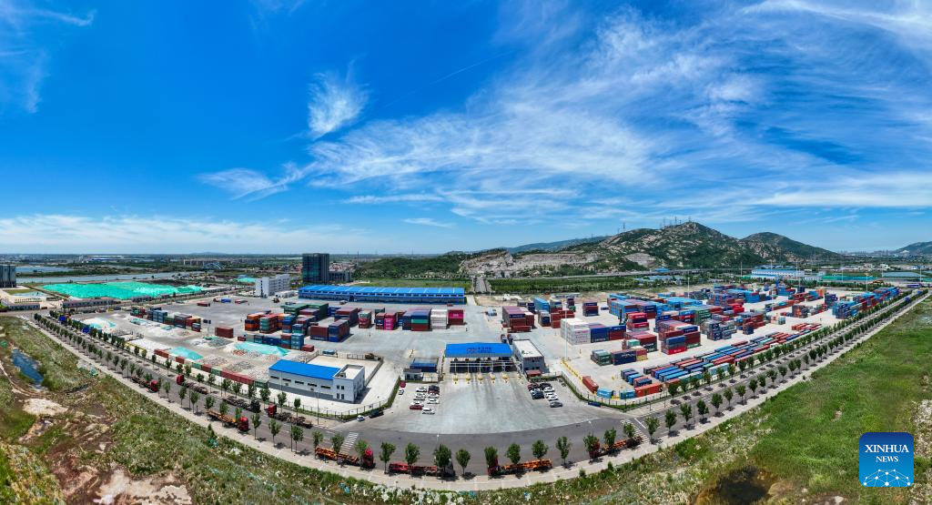 An aerial drone photo taken on June 26, 2024 shows a view of the SCO (Lianyungang) International Logistics Park in Lianyungang City, east China's Jiangsu Province. (Xinhua/Ji Chunpeng)