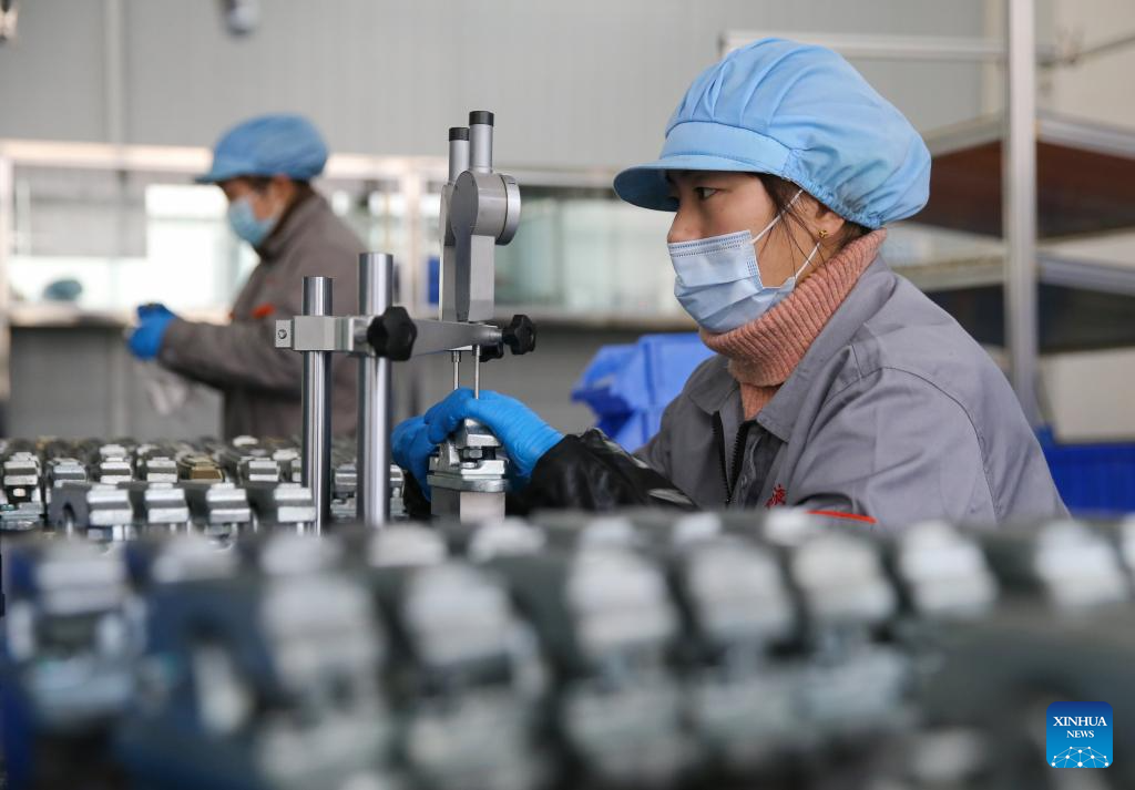Workers operate at the workshop of an enterprise manufacturing hydraulic products at the SCO (Lianyungang) International Logistics Park in Lianyungang City, east China's Jiangsu Province, Feb. 14, 2023. (Photo by Wang Jianmin/Xinhua)
