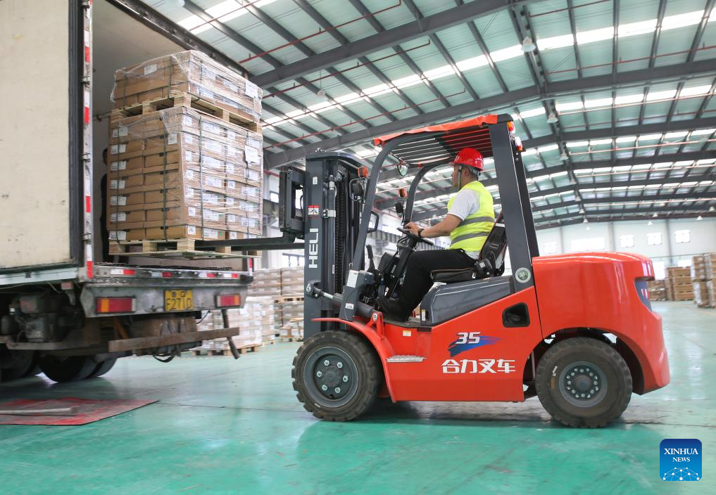 A worker loads packed products onto a truck at the Uzbekistan automotive parts distribution center at the SCO (Lianyungang) International Logistics Park in Lianyungang City, east China's Jiangsu Province, July 1, 2024. (Photo by Wang Jianmin/Xinhua)