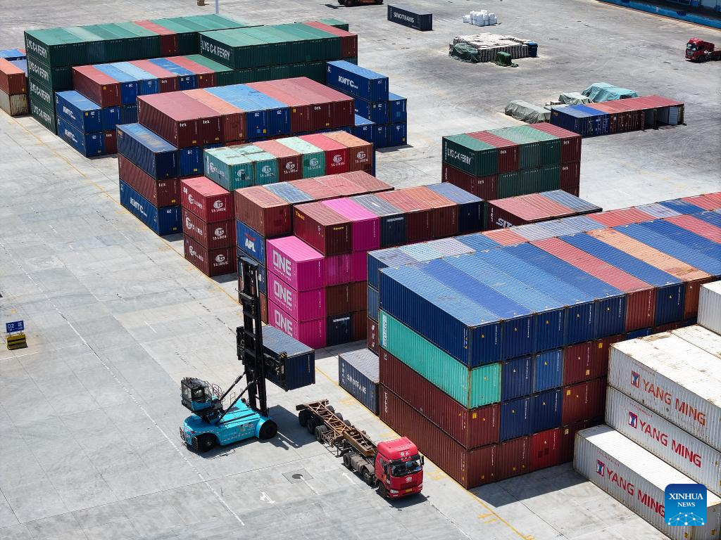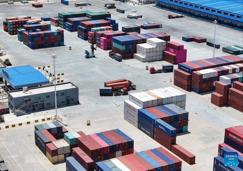 An aerial photo taken on June 26, 2024 shows a container yard of Sinotrans at the SCO (Lianyungang) International Logistics Park in Lianyungang City, east China's Jiangsu Province. (Xinhua/Ji Chunpeng)