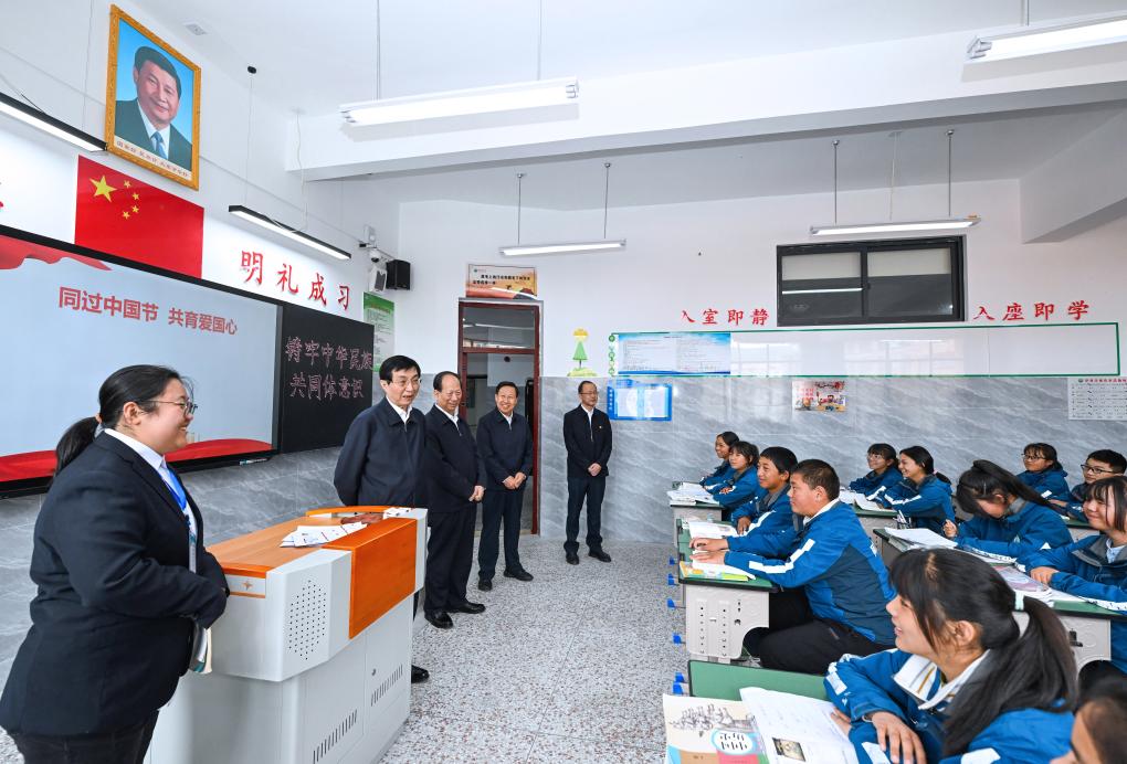 Wang Huning, a member of the Standing Committee of the Political Bureau of the Communist Party of China Central Committee and chairman of the National Committee of the Chinese People's Political Consultative Conference, learns about educational efforts in patriotism as well as ethnic unity and progress at a middle school in Aba Tibetan and Qiang Autonomous Prefecture, in southwest China's Sichuan Province, July 3, 2024. Wang made an investigation and research trip to Tibetan-inhabited areas of southwest China's Sichuan Province from Monday to Wednesday. (Xinhua/Rao Aimin)