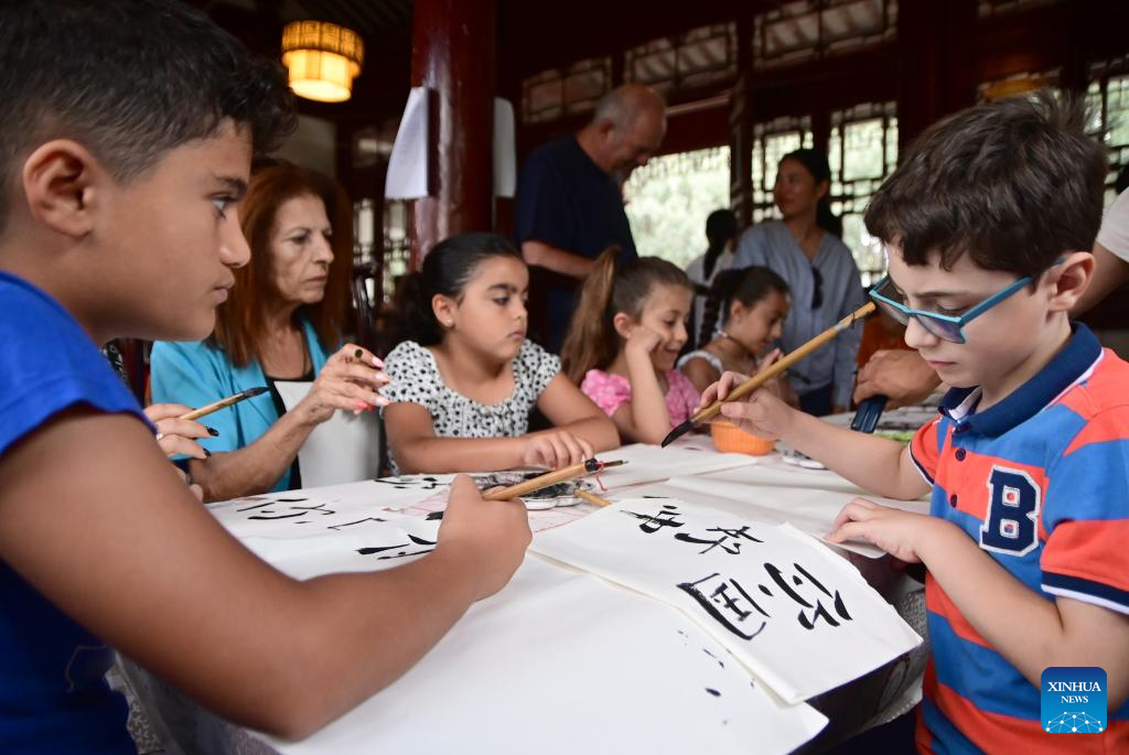 People experience Chinese calligraphy at the Chinese Garden of Serenity in Santa Lucija, Malta, on July 4, 2024. Maltese people of all ages immersed themselves in traditional Chinese culture at an event on Thursday at the Chinese Garden of Serenity in Santa Lucija. (Photo by Jonathan Borg/Xinhua)
