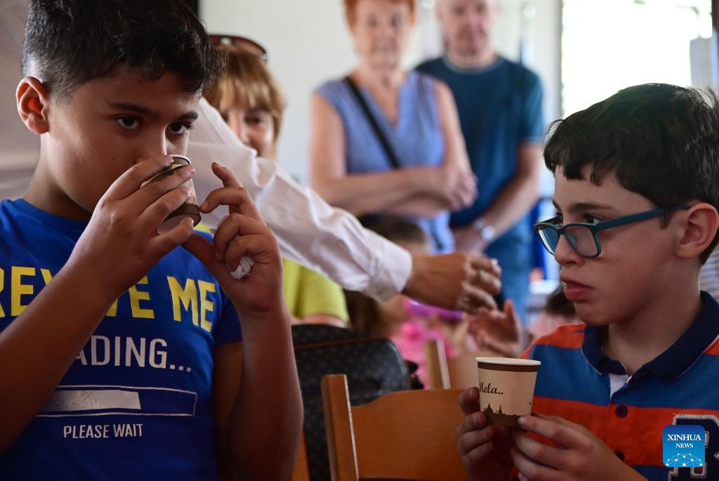 People taste Chinese tea at the Chinese Garden of Serenity in Santa Lucija, Malta, on July 4, 2024. Maltese people of all ages immersed themselves in traditional Chinese culture at an event on Thursday at the Chinese Garden of Serenity in Santa Lucija. (Photo by Jonathan Borg/Xinhua)