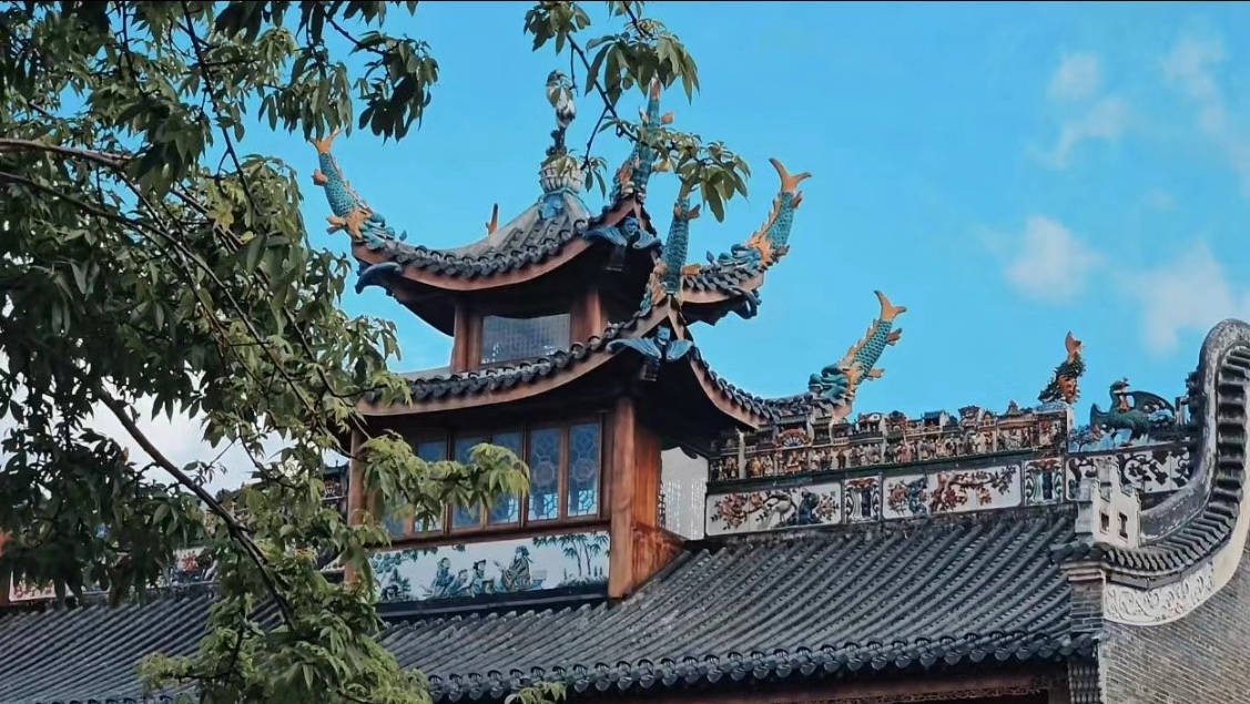 Photo taken on July 3, 2024, shows a roof with clay carving art in Kaiping, south China’s Guangdong Province. (People’s Daily Online/Zhong Wenxing)
