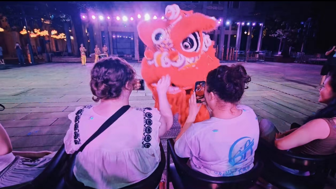 British students watch a lion dancing performances at Chikan town in Kaiping, south China's Guangdong Province, July 3, 2024. (People’s Daily Online/Zhong Wenxing)