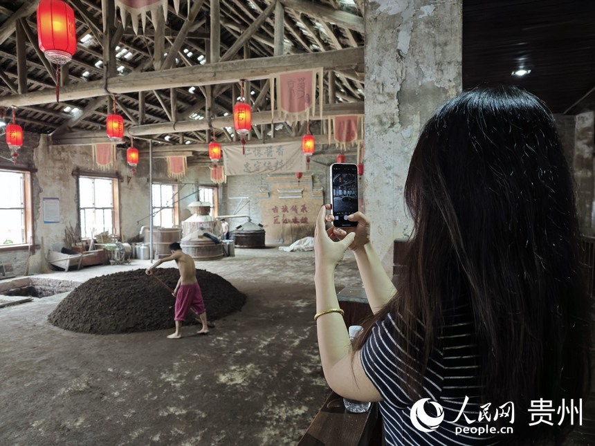 A tourist photographs the process of making Moutai-flavor liquor at a specialty chateau in Maotai township, Zunyi, southwest China's Guizhou Province. (People's Daily Online/Weng Qiyu)