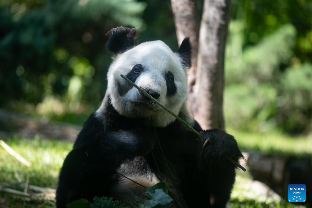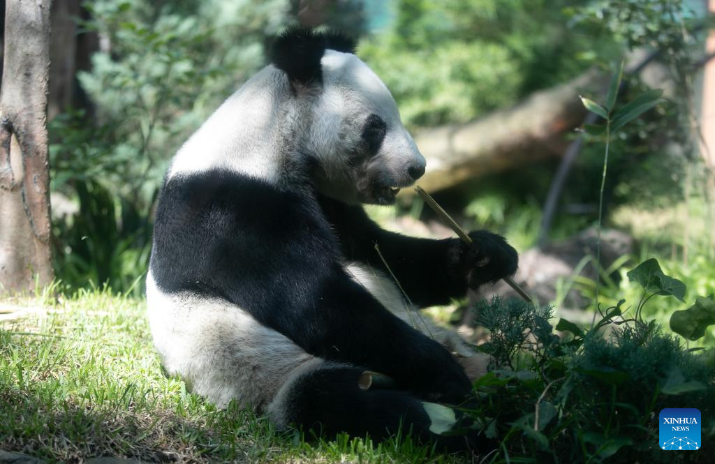 Giant panda Xin Xin eats bamboo at the Chapultepec Zoo in Mexico City, Mexico, July 4, 2024. (Xinhua/Li Mengxin)