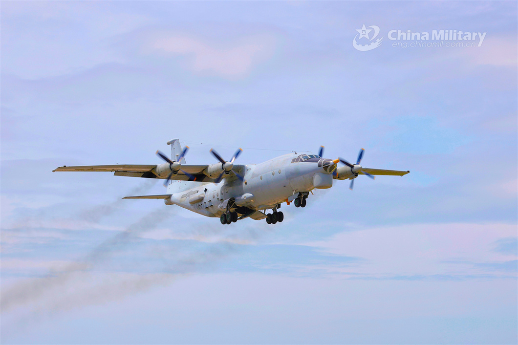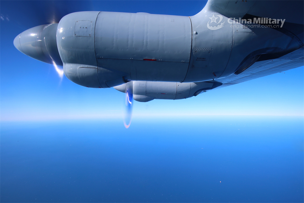 A reconnaissance aircraft attached to a PLA naval aviation regiment patrols in the sky during a round-the-clock flight training exercise. (eng.chinamil.com.cn/Photo by Ge Qihao)